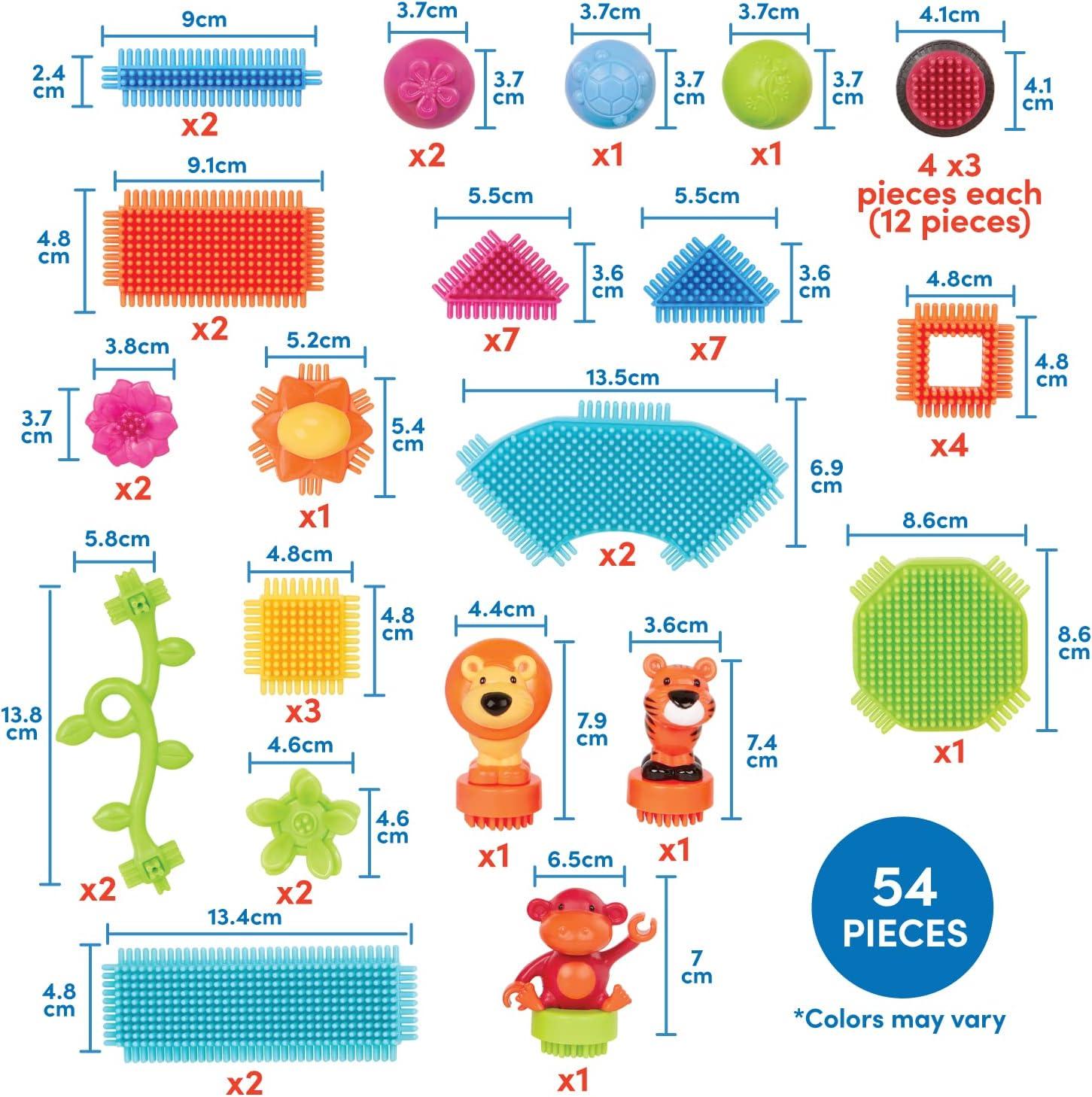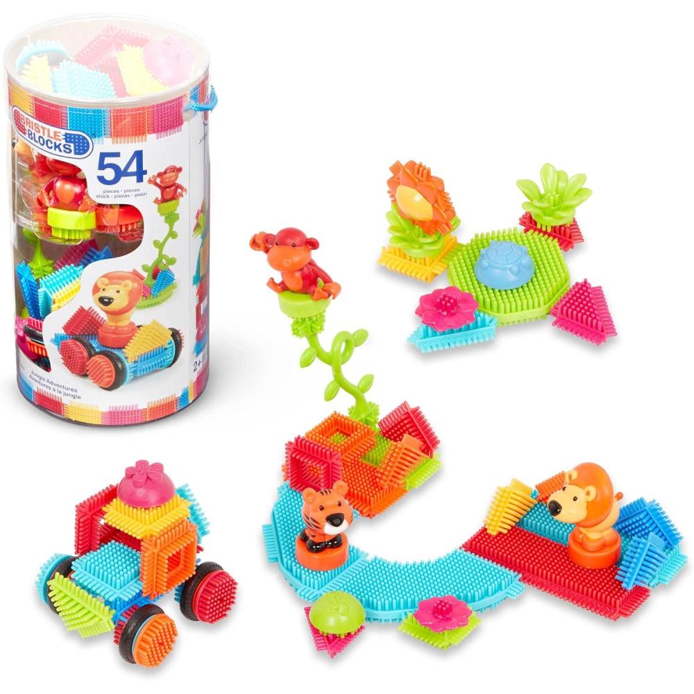 Bristle blocks have soft, interlocking bristles that stick together at any angle for frustration-free building. The Jungle 54 Piece Bristle Blocks are perfect to stimulate young minds. Features 4 wheels, 3 animals and plant in vibrant colors. Ideal for toddlers.