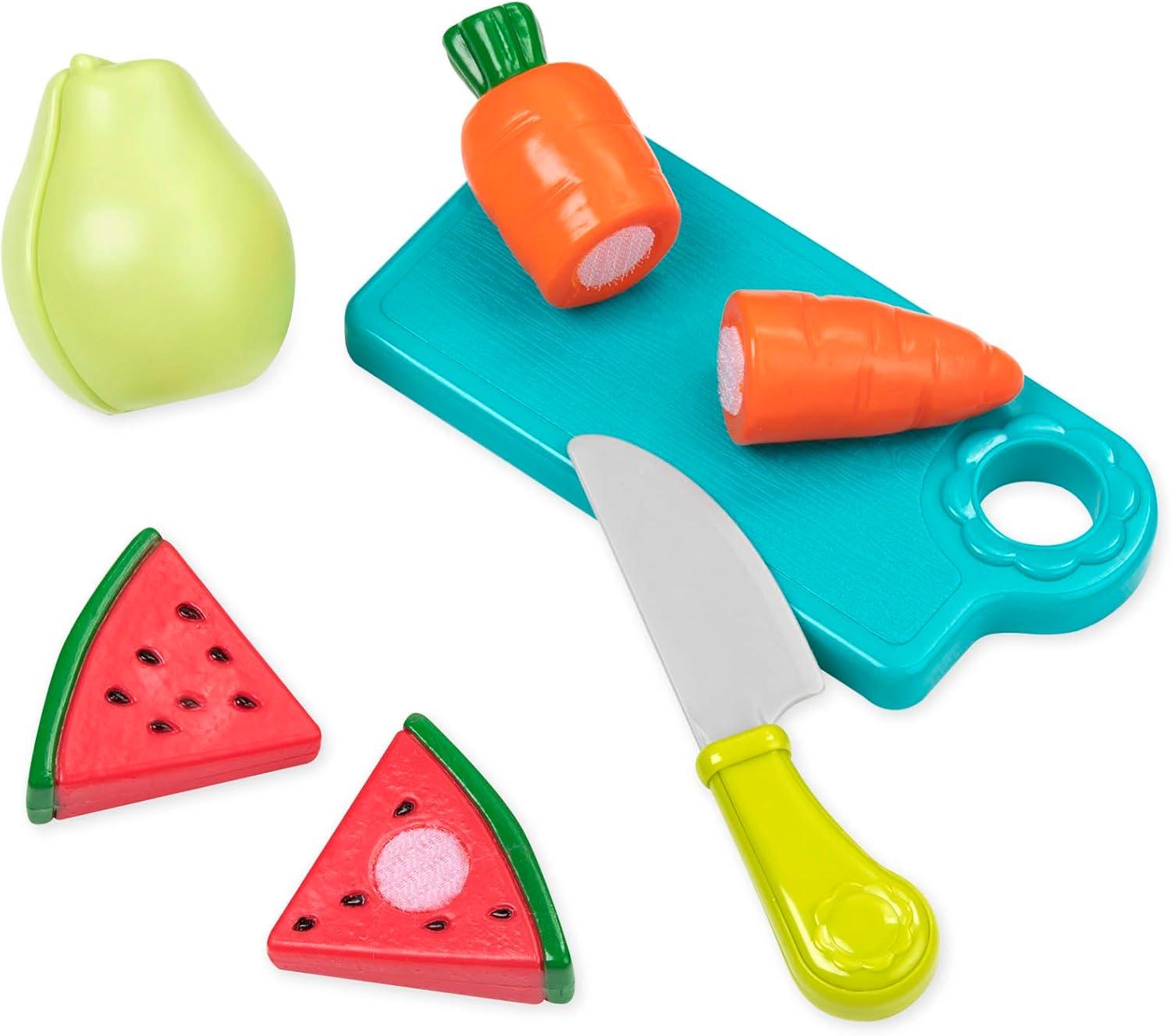 “Attention little shoppers, we've got a fun kids’ grocery cart and play food combo on aisle 7!” battat’s deluxe toy shopping cart and groceries bundle includes all the supplies toddlers need for a trip to both the market and the kitchen! The toy grocery cart is designed especially for little hands to grab, push, and pretend shop in the supermarket! And, it's filled with the finest toy food, from delicious apples and oranges, to dry goods, for an extra realistic shopping experience! These cute fruit and veggie toys encourage healthy food options and promote imaginative play. Pretend to chop up the vegetables on a cutting board with one of the 2 kid-friendly knives included in this combo. The safe plastic knives even ‘cut’ the veggies, held together by fasteners, in half. Create a delicious pretend vegetarian feast with the Battat shopping cart & groceries bundle! Recommended for little chefs aged 3 years old and up.