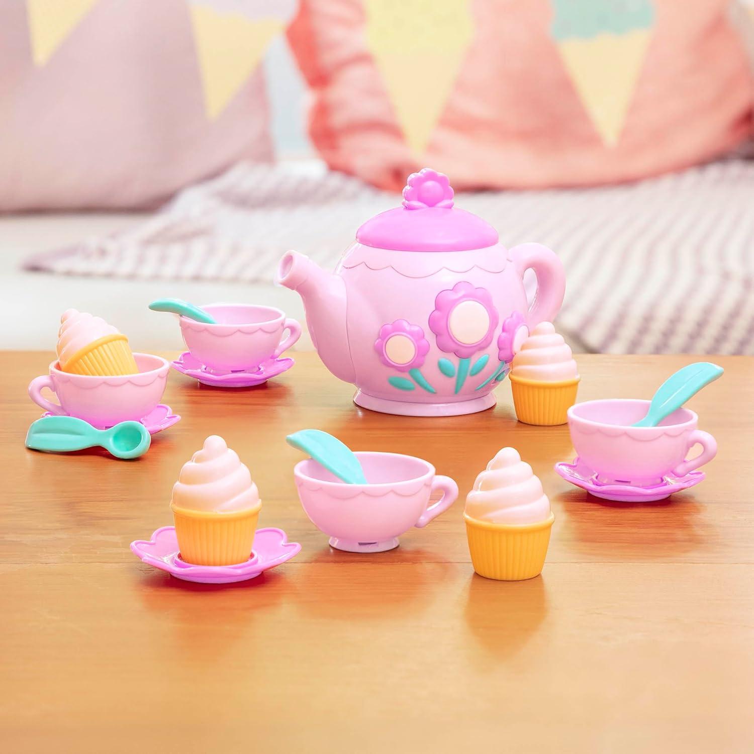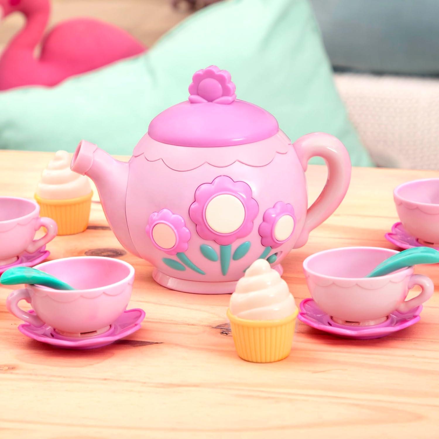 Tea for two with your doll and you, or pour some more and have tea for four! You’ll love singing along with the La Dida Musical Tea Party by Play Circle, a colorful 17-piece tea party set that looks like it came straight out of the enchanted garden. Realistic boiling and whistling sounds help you brew cup after cup of delicious pretend tea and the three pretty melodies mean you can also serenade your tea party guests. Complete with four place settings just perfect for growing imaginations, like the flower-shaped saucers and delicate leaf-shaped spoons, a flowery singing teapot, and delightful pretend snacks, this toy tea set will delight your little ones every time. Two AAA batteries are included so the fun can get started as soon as the box is opened! Made from food-safe plastics, it’s ok if someone forgets the “pretend” part of the pretend tea party.
