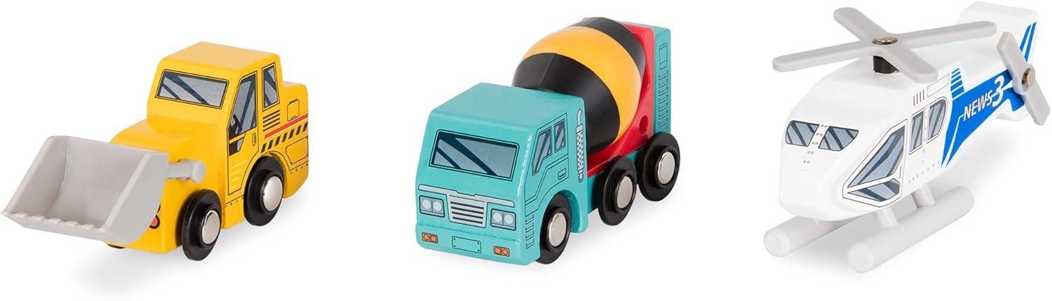 The Wooden Vehicles Set 1 by Battat comes with 6 wooden vehicles for hours of imaginative play! Need to take a toy car to the pretend repair shop? Just attach it to the toy tow truck’s magnet to get it there safely. The toy helicopter comes with a moving propeller that your little one can spin, spin, spin! On the make-believe construction site, your kiddo can move the toy excavator’s shovel up and down and spin the toy cement truck’s mixer! There are also 2 emergency vehicles to roll around in your pretend city. These wooden toy vehicles are a ton of fun, and they’re also great for developing your kiddo’s fine motor skills! Made of worry-free and durable materials, all Battat products meet or exceed EU, U. S. and Canadian safety standards.
